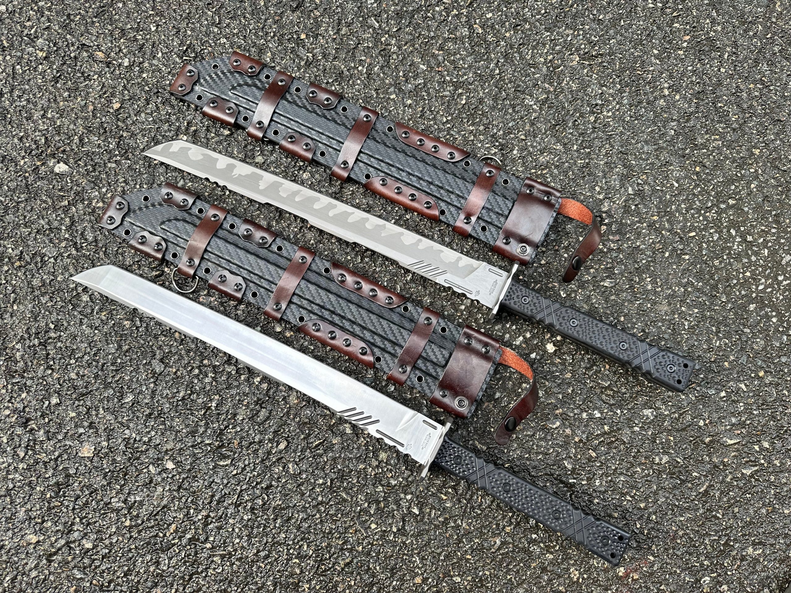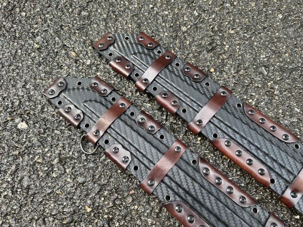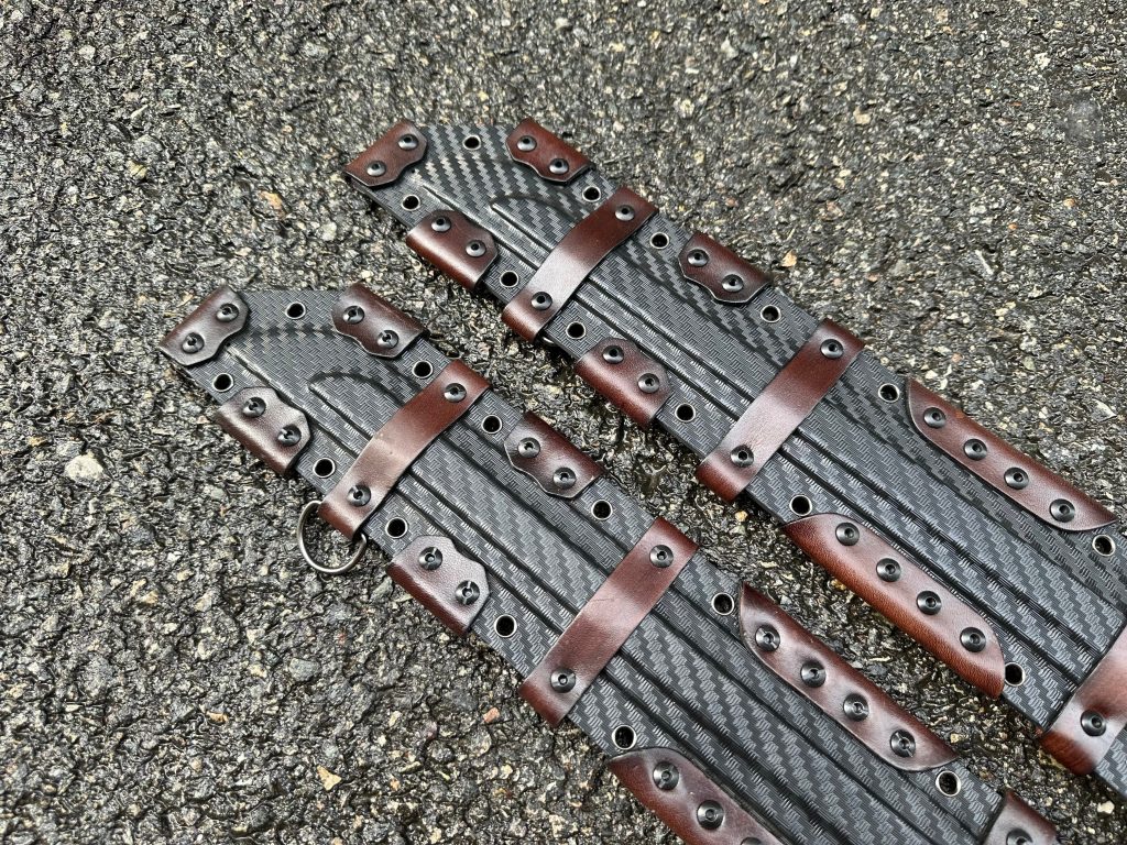 The knife is accompanied by a premium carbon fiber Kydex sheath, accented with leather, offering secure, accessible carry and premium protection. It represents a complete, ready-to-deploy system.